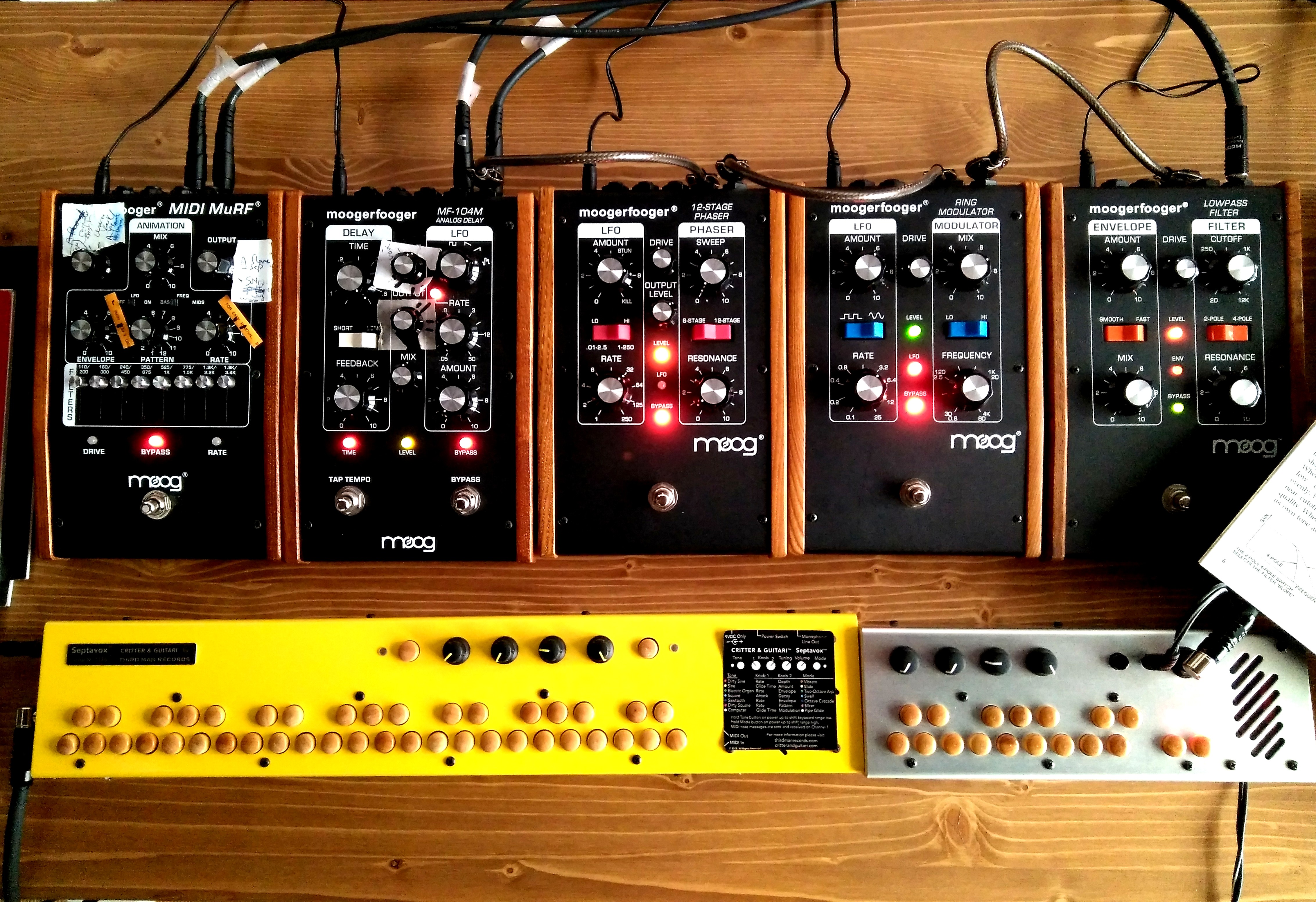 The very early stages of working on a new album are some of my favorite moments in the album-making process: I usually know where I want to be headed, but there is a world of difference between audio daydreaming and tangible sonic reality. So it’s a thrill to install new pieces of gear and get the first feel of how simultaneously challenging and fun the exploration of sound is going to be: everything still needs to be understood in depth, tested in all possible combinations, until slowly, those sonic glimpses start to gel into actual music. This is only part of the setup I intend to use, and there’s already so much to explore in there: whenever I see those 5 Moogerfoogers together, the French expression “brochette de Moogerfoogers” (“Moogerfooger skewer”) comes to my mind!