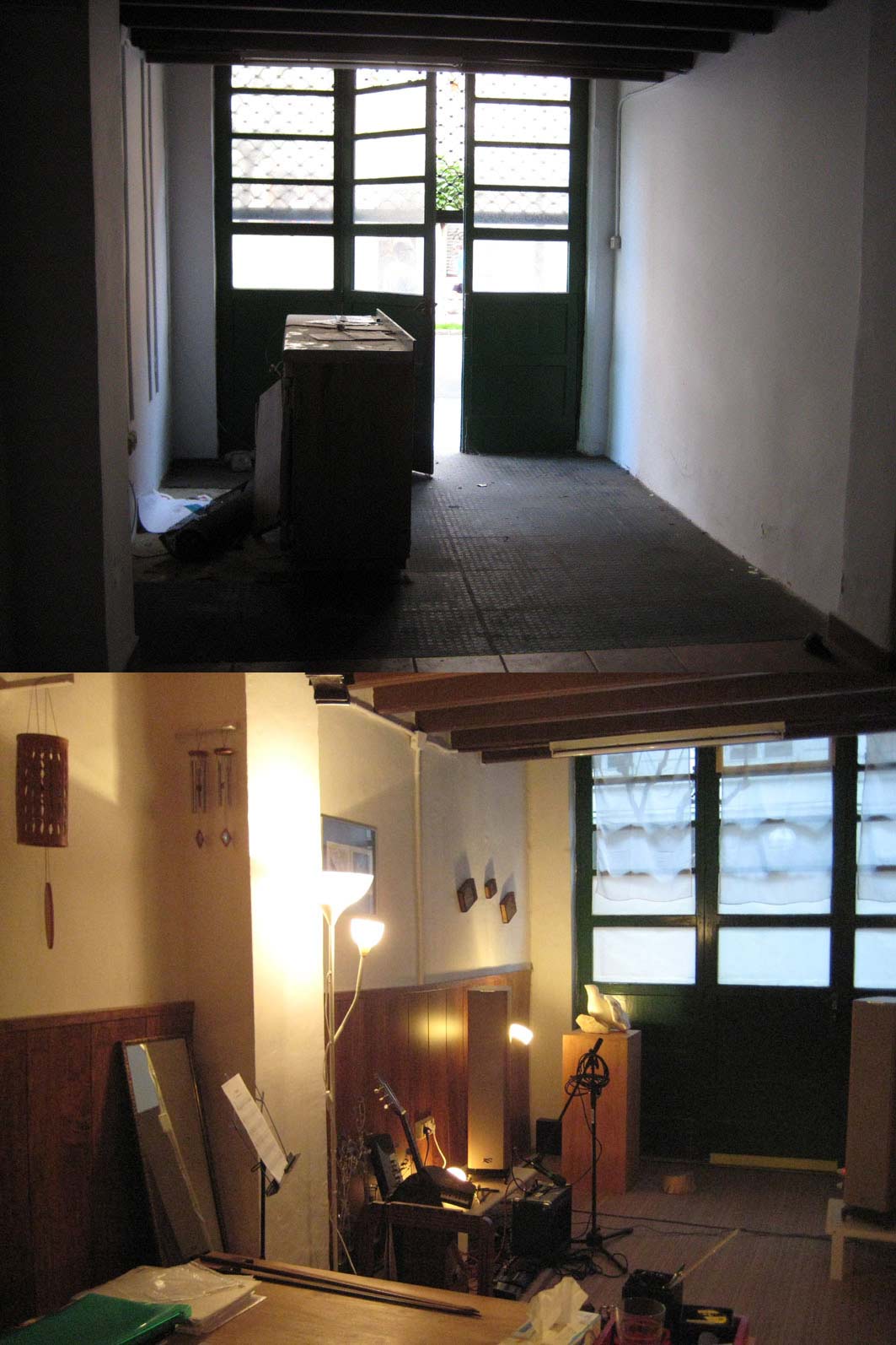 When I decided to move to San Sebastián in 2010, I knew that I would not have the option of working from home as I did in Paris, as the flat where I would live simply did not have a sufficient amount of space available, and I was also acutely aware of being clearly in need of a space where I could focus on going back to making music, far away from the potential distractions of home, whether that meant replying to emails, getting the laundry done, or trying that new cake recipe (I was really passionate about cooking back then!). I went in search of the ideal “local” (the Spanish word for ground floor or basement spaces not intended for living), no easy task given how insanely expensive San Sebastián already was, and ended up finding one in a neglected area of my neighbourhood: even though it stank of mould (it hadn’t been used in years and was formerly a brinery distributing olives and guindilla peppers to the local bars), I immediately felt drawn to its high wooden ceiling and overall feel. It also seemed like just the right amount of space, with 21m2 downstairs, and a mezzanine of roughly the same size, high enough for me to stand up, welcome my ceramics, vinyl and music book collection, and instrument cases – and more crucially, this mezzanine could act as a “cushion” protecting the 1st floor neighbours from the sound of my music. It was also really close to where I lived, and a mere 5 minutes walk from the Zurriola beach – what more could I want?
