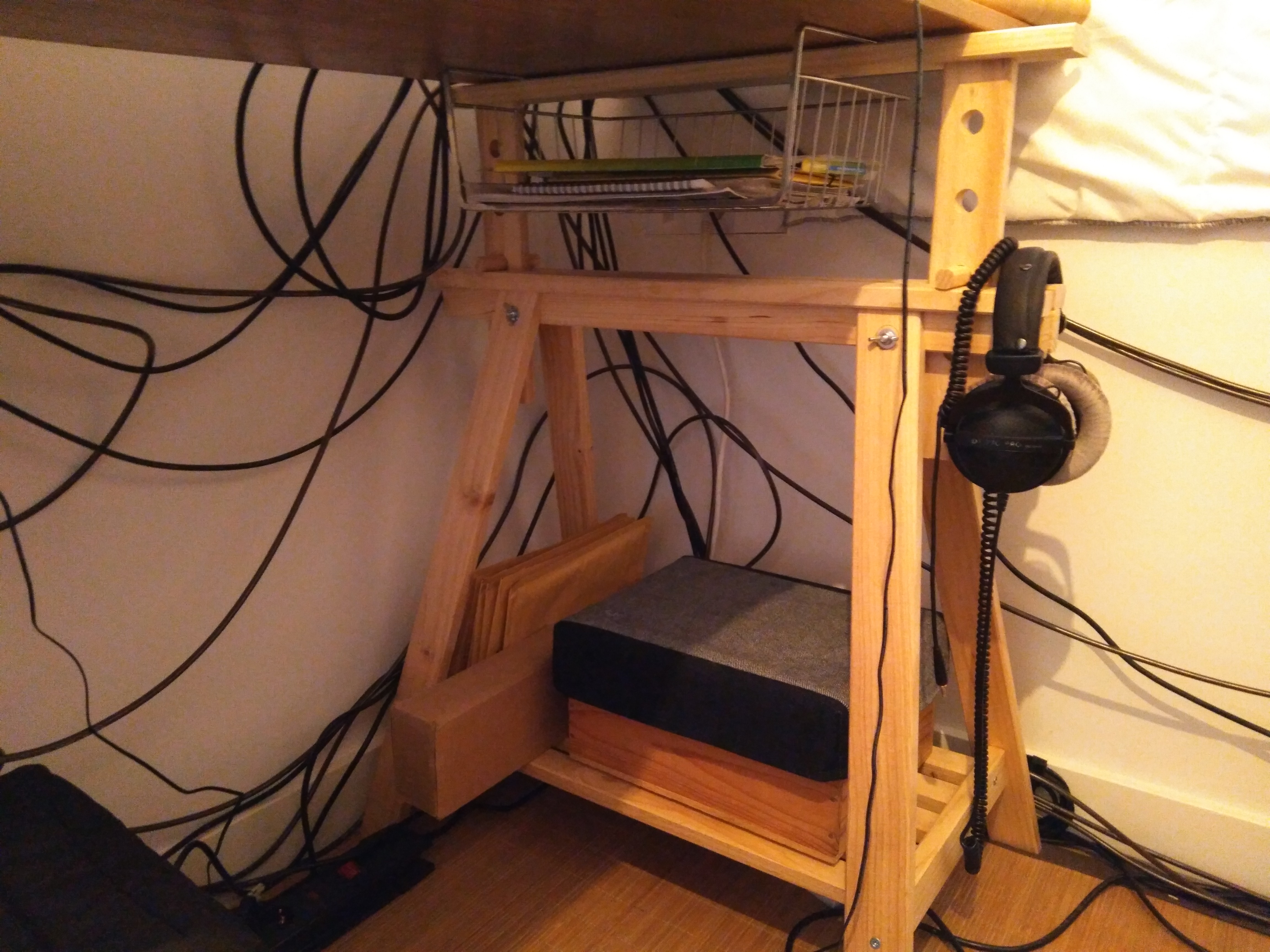 The tabletops sit on heavy duty trestles manufactured with certified pine wood by a Basque company, super sturdy so no worries about piling up gear, and can be adjusted to the desired height (the music side is higher up so I can play standing if I want to). The bottom “shelves” of the trestles are used to store (formerly wine) boxes containing cables, power supplies and whatnots, or to hold my nearfield monitors’ sub so it doesn’t rest directly on the floor. The contents of the boxes is protected from the dust with covers I sewed from Japanese denim I bought in Tokyo when I played at Mutek in 2018. There’s also room underneath the trestles to accommodate more objects if necessary. I also hang my headphones on them, and last but not least, a plank of plywood slid on top of the trestles on the recording side holds the folders containing my recording notes and other miscellaneous stuff, while 2 wire baskets hold manuals, gear templates and music scores on the music side.