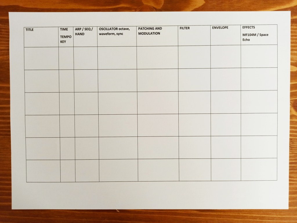 I have finally managed to put together a list of the songs I am going to record – everything live, no edits. It looks pretty insane on paper, but I will probably fuse some of those variations, leading to fewer tracks. Synthesis is a lot of fun, and whenever something is really fun, you run the risk of not really hearing the music behind your fun, so to help with critical hearing, I have made a “synthesis table” to keep objective track of what I do.