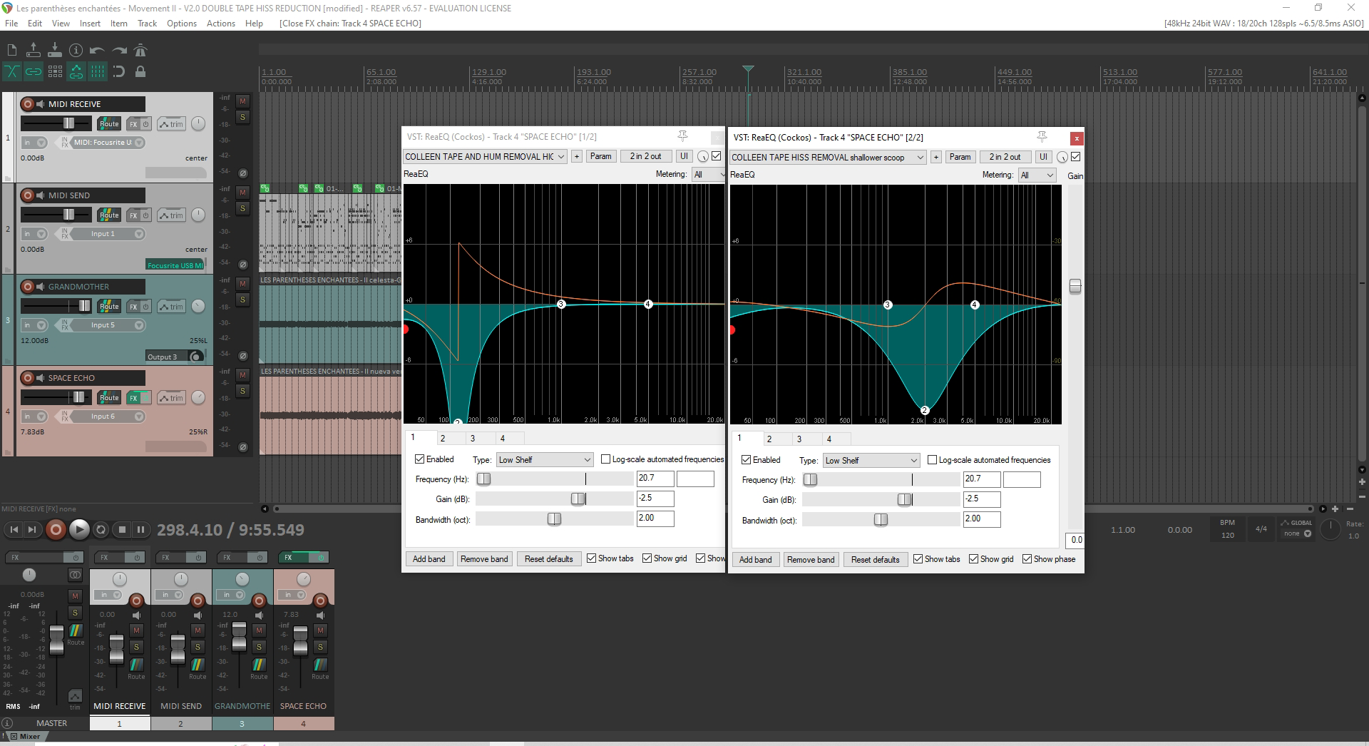 – Mvt III is the only song on the album that uses 2 Grandmother parts, which means double the amount of hiss… The second part is played about 2 octaves higher than the first and for some reason, on top of the hiss, I also had a slight hum. This time I kept the notch and I managed to get rid of both hiss and hum in one go.