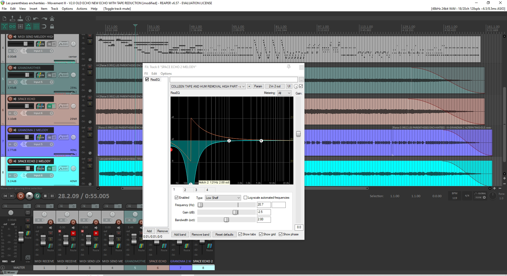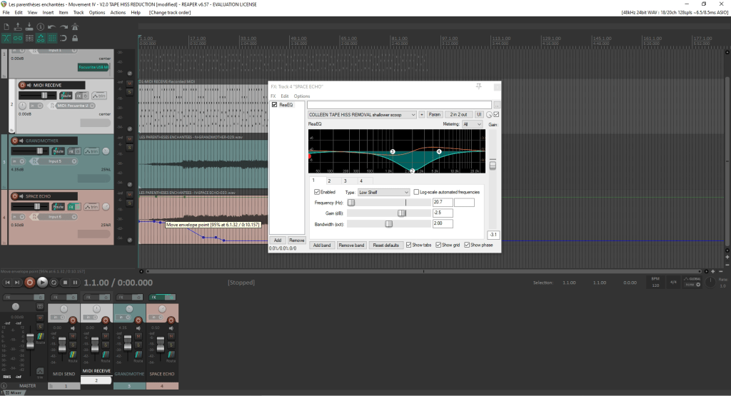 As you can see from this screen grab from my DAW Reaper showing the MIDI file created as I played the song live, the Grandmother and the 100% Wet Space Echo soundwaves, the songs where I had to do this EQ job all had in common that they were played by hand at a slow pace, with silence between notes. They also don’t have synthesis action going on: they are made up of very pure tones that stay even during the song. It is during those Grandmother silences that a kind of swishing, ebb-and-flow effect happens with the tape hiss, since the Echo produces a more constant sound that appears louder when the Grandmother is not playing.