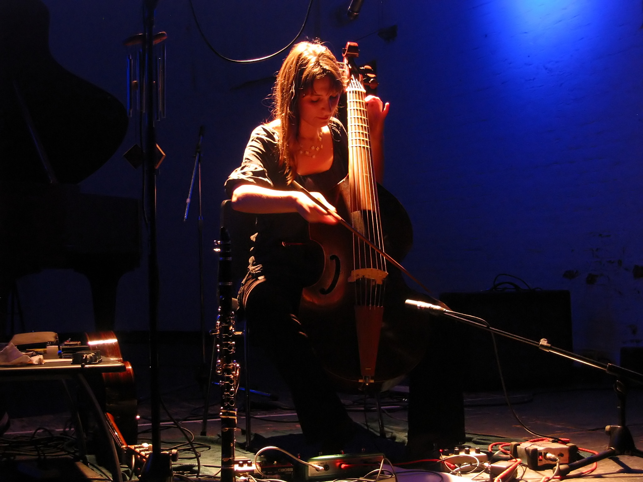 Bass viola da gamba: “Les ondes silencieuses” (4), “Le bateau”(9) and the finger-picked part of “Blue Sands” (5), stereo take with Beyer M260 ribbon and Beyer MC834; AKG C460B pencil condenser for harmonics on “Blue Sands” (5).